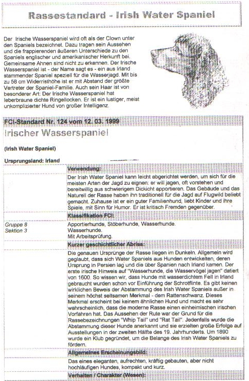 Der Irish Water Spaniel wird gerne als Clown unter den Spanielrassen bezeichnet, dazu tragen sein Aussehen , dichte braune Ringellocken und seine Rute der sogenannte "Rattenschwanz" mit bei. Mit bis zu 58 cm ist er der größte unter den Spanielrassen. Er ist ein unkomplizierter und auch unaufgeregter Hund der wenig bellt und sich im engen Zusammenleben mit sportlichen Menschen sehr wohl fühlt. Fremden gegenüber ist er zuweilen scheu und zurückhaltend.